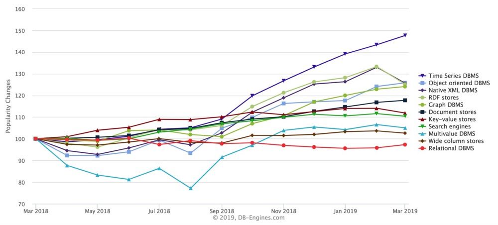 过去12个月时序数据库(Time Series DBMS)热度不断增长