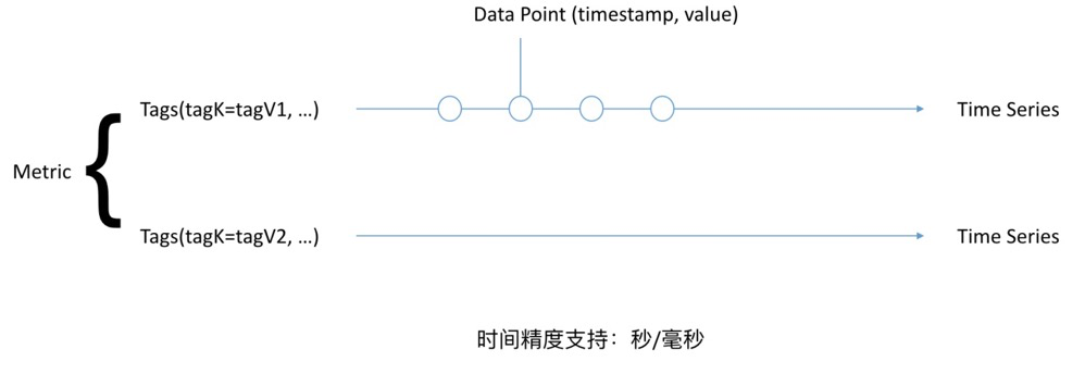一条时间线由Metirc + 多个tag唯一确定,时间线上会有源源不断的数据点(Data Point)写入,数据点由时间戳和值组成。OpenTSDB支持秒级(10位整数),毫秒级别(13位整数)两种时间精度。