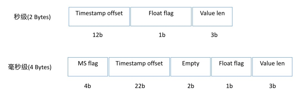 这是列名(HBase中称为qualifier)的格式,可以看到毫米级需要多出2个字节。所以如果你的采集间隔不需要精确到毫秒级别,那请一定使用秒级(10位整数)。Value只能存储整数和浮点,所以有一个bit存储Float flag。