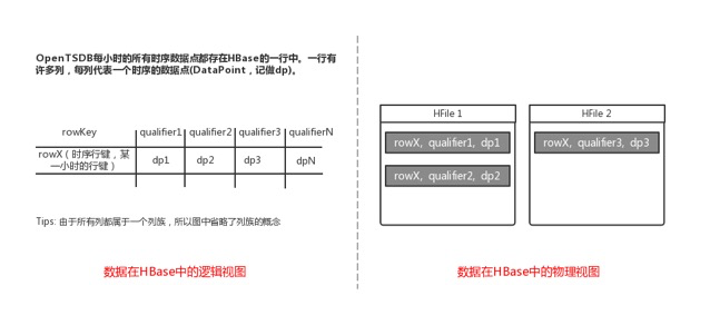 前面提到过OpenTSDB一行一小时的特点,那么一行里会有很多KV。表面上看起来好像没什么问题,但是实际上对比逻辑视图和物理视图你会发现一些问题。