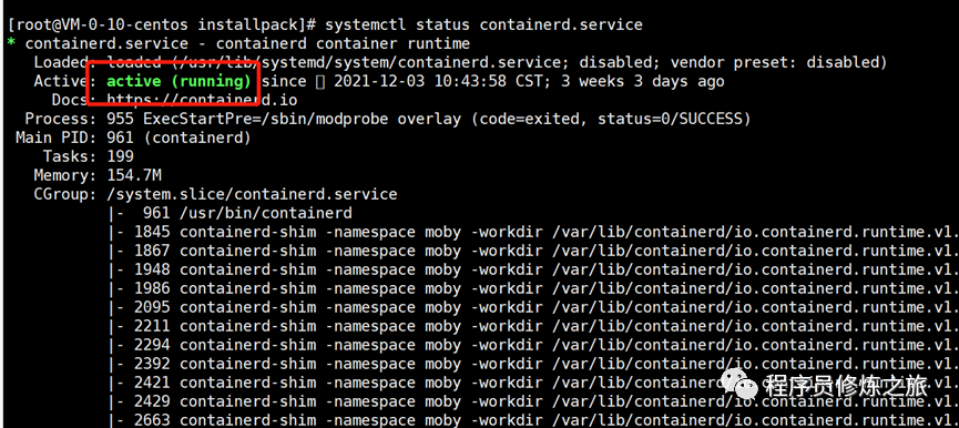 依次执行以上命令,最后看到绿色的【active(running)】,那恭喜您containerd服务配置启动成功。如果服务启动失败,还是终极杀手锏来解决:先尝试重启docker,如还是不行在尝试重启服务器,反正我是没有重启