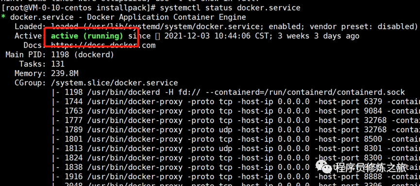 依次执行以上命令,最后看到绿色的【active(running)】,那恭喜您docekr.service服务配置启动成功。如果服务启动失败,还是终极杀手锏来解决:先尝试重启docker,如还是不行在尝试重启服务器,反正我是重启服务器才成功的。
