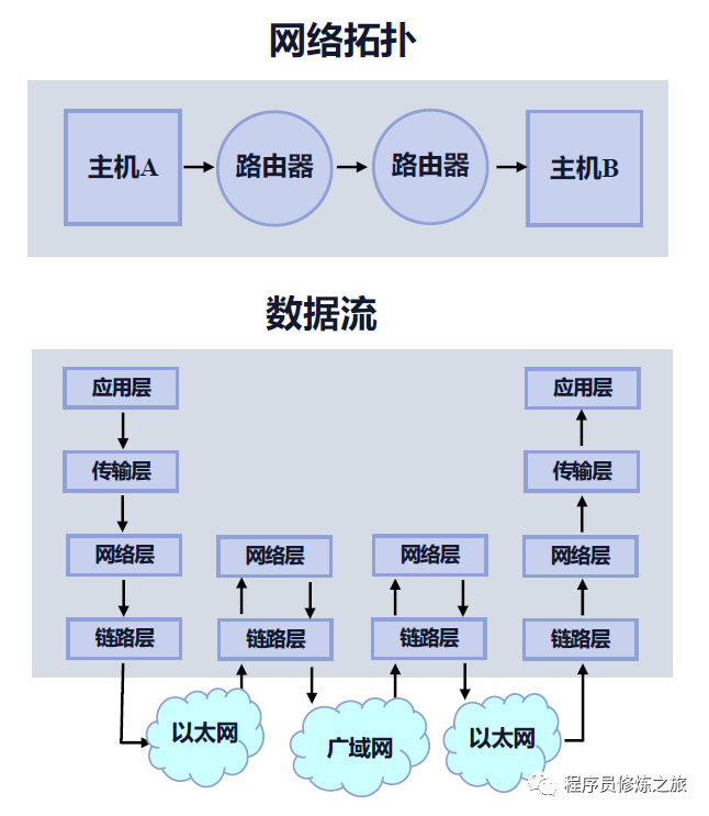 应用层里发送了一个 GET 请求 -> 到了传输层,这一步主要在做一件事,就是浏览器打开了一个端口,在 windows 的任务管理器中可以看到这一点,他会把这个端口记下来以及把 Nginx 打开的端口比如 80 或者 443 也记到传输层 -> 然后在网络层会记下我们主机所在的 IP 和目标主机,也就是 Nginx 所在服务器公网 IP -> 到链路层以后 -> 经过以太网 -> 到达家里的路由器(网络层),家中的路由器会记录下所在运营商的一些下一段的 IP -> 通过广域网 -> 跳转到主机 B 所在的机器中 -> 报文会经过链路层 -> 网络层 -> 到传输层,在传输层操作系统就知道是给那个打开了 80 或者 443 的进程,这个进程自然就是 Nginx -> 那么 Nginx 在他的 HTTP 状态处理机里面(应用层)就会处理这个请求。