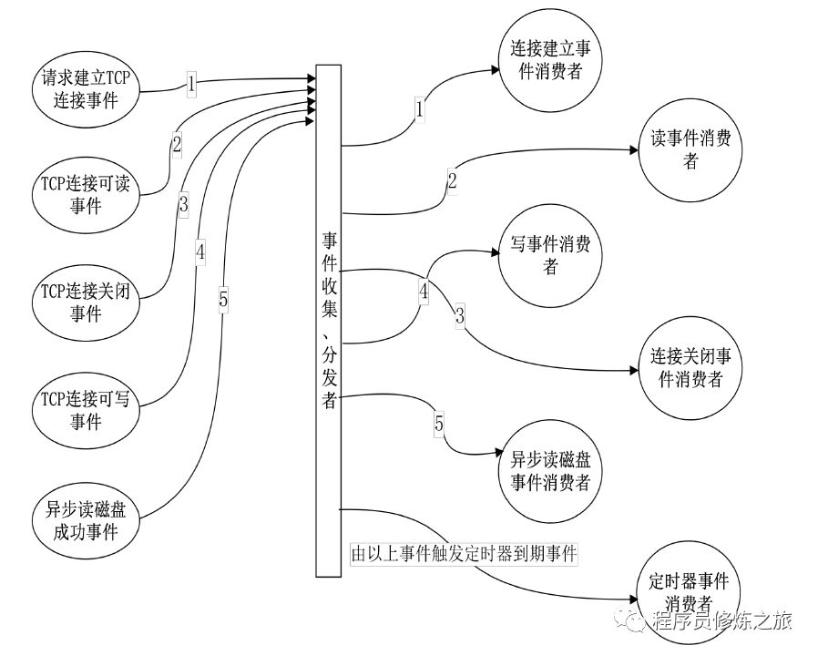 像这样的一些网络读写事件,通常在 Nginx 中或者任何一个异步事件的处理框架中,他会有个东西叫事件收集、分发器。会定义每类事件处理的消费者,也就是说事件是一个生产者,是通过网络中自动的生产到我们的 Nginx 中的,我们要对每种事件建立一个消费者。比如连接建立事件消费者,就是对 Accept 调用,HTTP 模块就会去建立一个新的连接。还有很多读消息或者写消息,在 HTTP 状态机中不同的时间段会调用不同的方法也就是每个消费者处理。