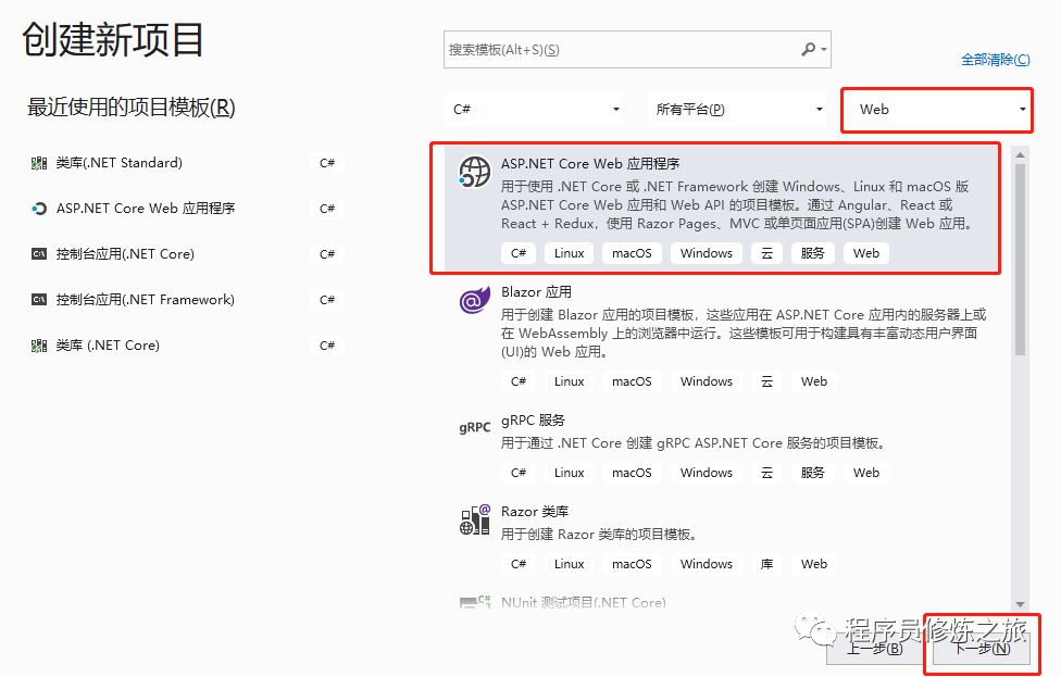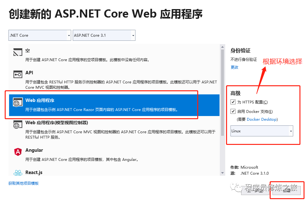 填写好项目名称,进入到如下界面,按照框红选择即可一个.net core 项目的创建