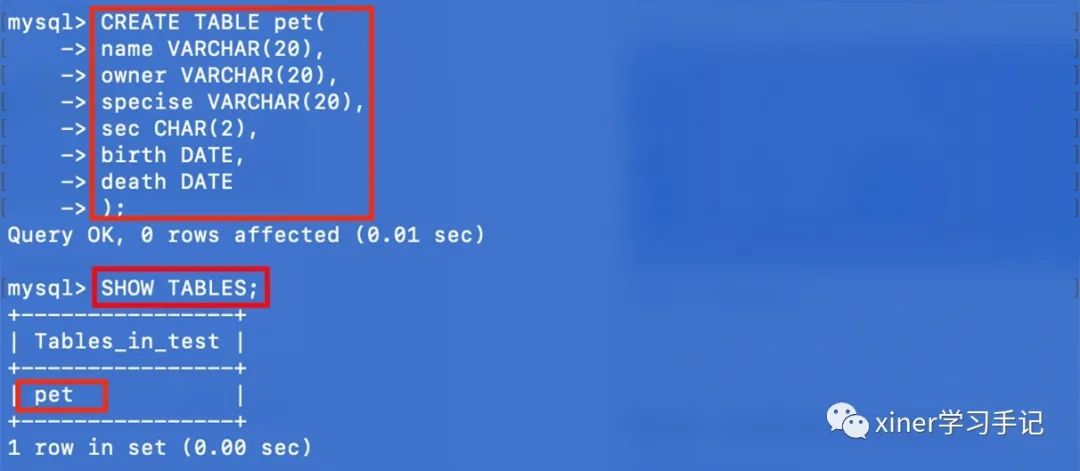 第二步,创建新的数据表pet,并查看是否成功创建。