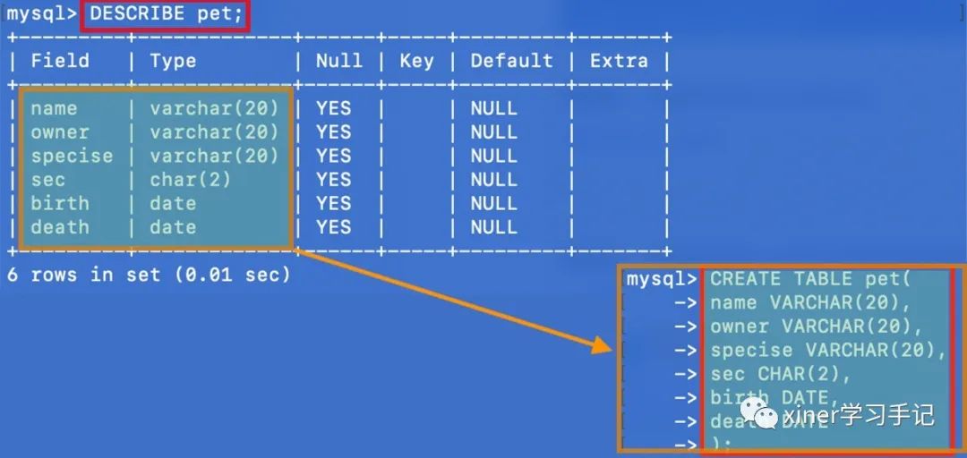 第三步,查看数据表pet的表结构。