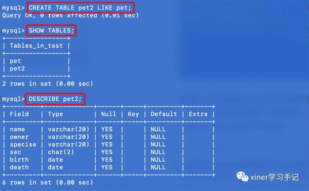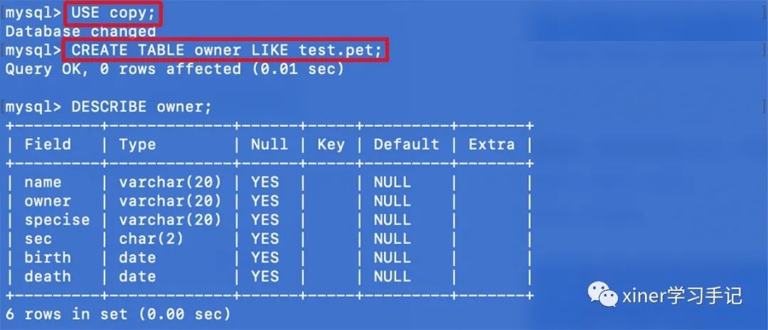 CREATE TABLE owner LIKE test.pet;