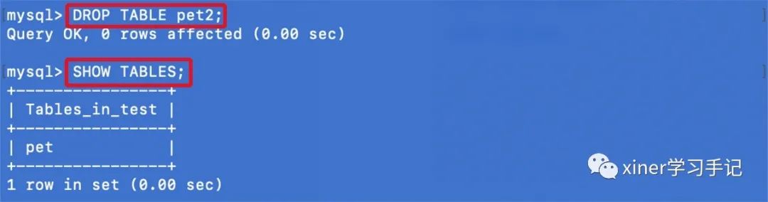 第五步,删除数据表 pet2,并查看是否成功删除。