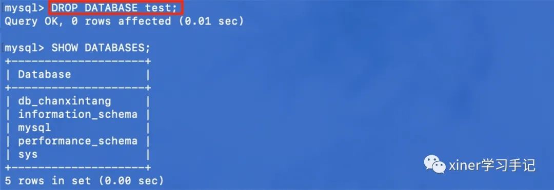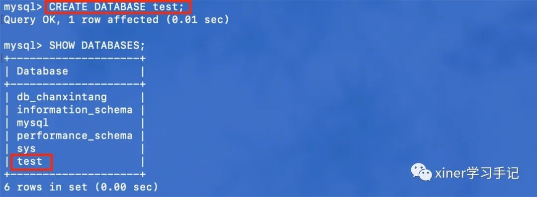 第二步,创建新的数据库 test,并查看是否成功创建。