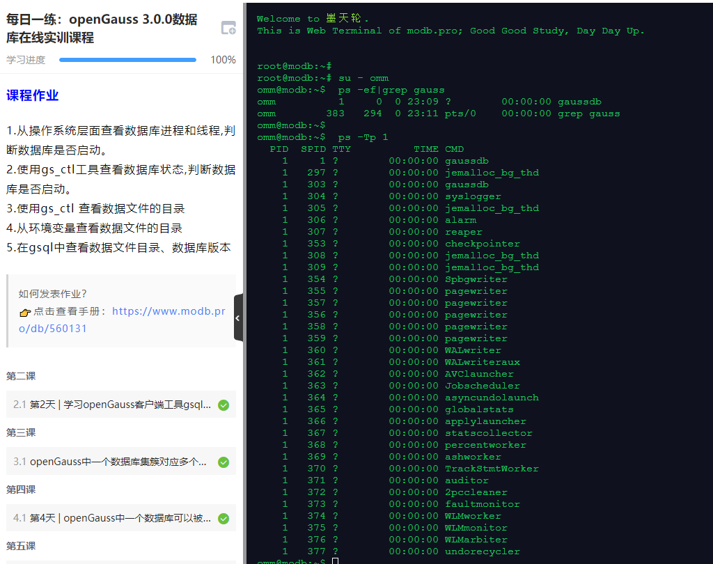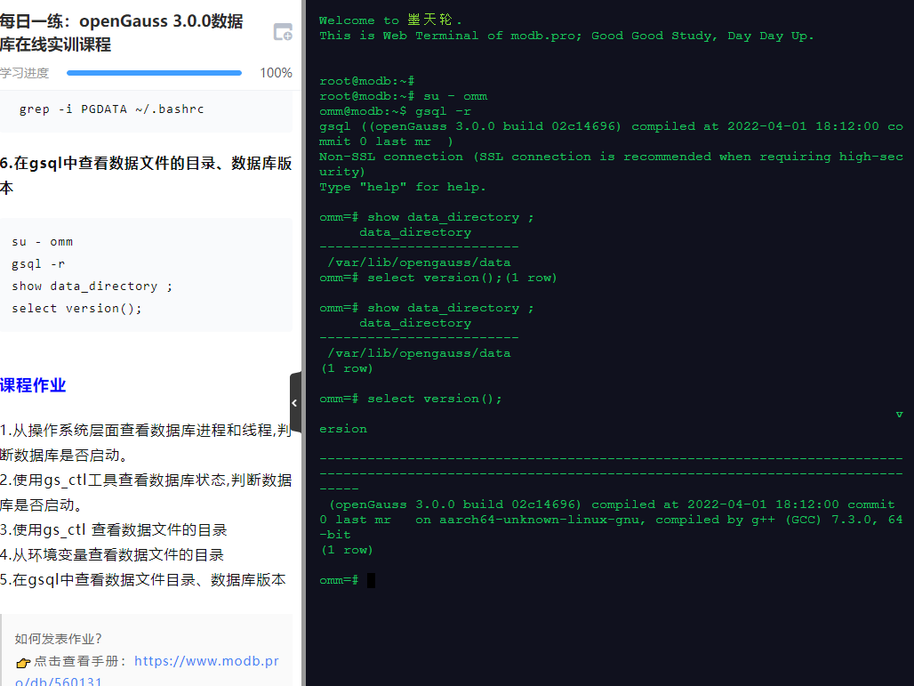 学习从操作系统层面和使用openGauss工具查看数据库的状态、版本和数据文件目录。