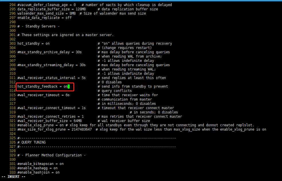 备节点node2的改法与主节点node1的修改方法一致,将hot_standby_feedback=off的注释去掉,同时将hot_standby_feedback=off改为hot_standby_feedback=on。