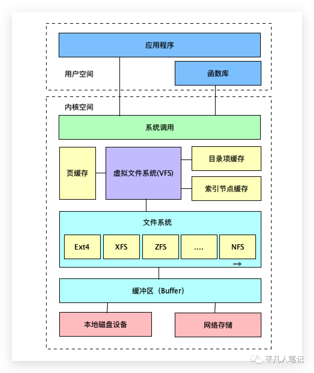 应用程序往一个文件写一段文本或字符串的时候,它会经过系统调用,一经过系统调用,就会从用户空间转变为内核空间 ,系统调用调用的是一个虚拟文件系统的接口,虚拟文件系统是操作系统为了屏蔽底层文件系统的不同实现的做的这么一套东西。