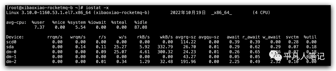 所以接下里会用到iostat的这个命令 iostat -x,这个命令是能够以扩展的模式去看整个io的情况,它能暴露出更多的io性能的指标,可以看io的使用率,还有它的一个饱和度。