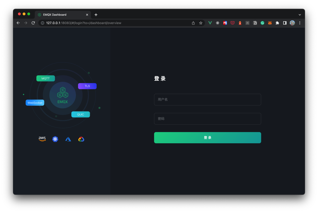 来访问 EMQX 的 Dashboard,查看 EMQX 的运行状态。如果能够正常访问到 EMQX 的 Dashboard,此时说明 EMQX 已经安装成功。