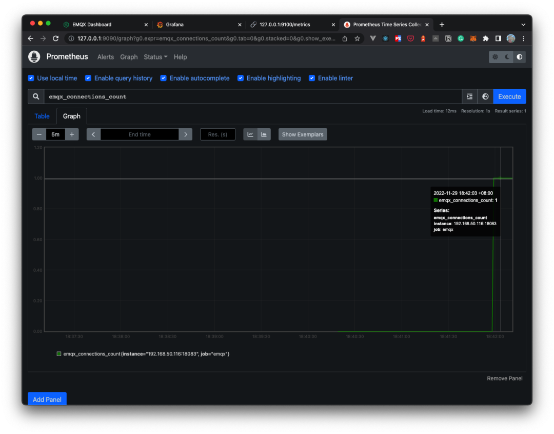 可以查找 EMQX 的监控数据,如果数据显示正常,就表示此时 Prometheus 已经成功启动,并成功采集到 EMQX 的监控数据。