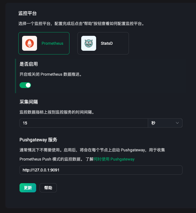 同样在帮助页面中,可以分为默认和使用 Pushgateway 两种配置方式。使用 Pushgateway 的配置方式,可以在页面中打开启动开关,输入 Pushgateway 的地址和上报数据时间,点击保存后,即可完成配置。