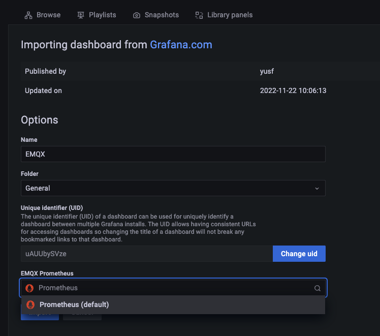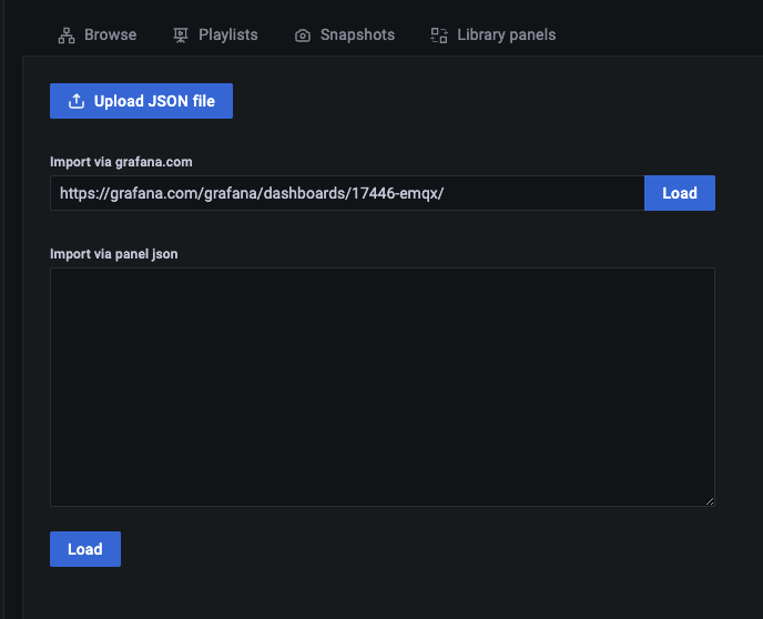 ,选择刚才下载的 Dashboard 模板 (https://grafana.com/grafana/dashboards/17446-emqx/)来导入,或直接输入 https://grafana.com/grafana/dashboards/17446-emqx/ 地址在Import via grafana.com