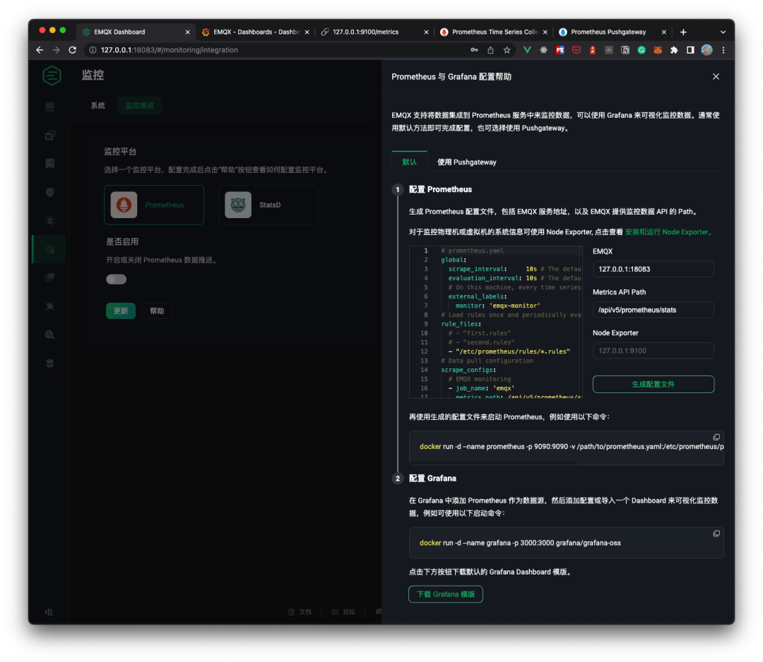 您只需要根据帮助页面的步骤提示,安装 Prometheus 和 Grafana 服务,然后在配置项填入一些关键的配置信息,如 EMQX 的地址、获取指标数据的 API 等,点击生成按钮就可自动生成并下载配置文件,还可以下载默认的 Grafana Dashboard 模板。
