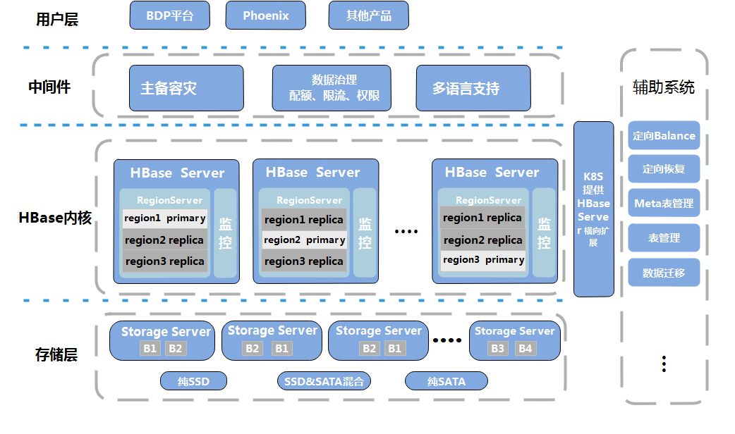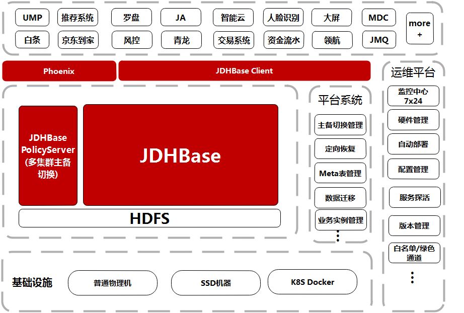 针对京东的业务场景和使用方式我们对HBase的使用方式做了很多思考与优化。将整个JD-HBase平台逻辑拆分成存储层、内核层、中间件层、用户层和一个辅助系统。