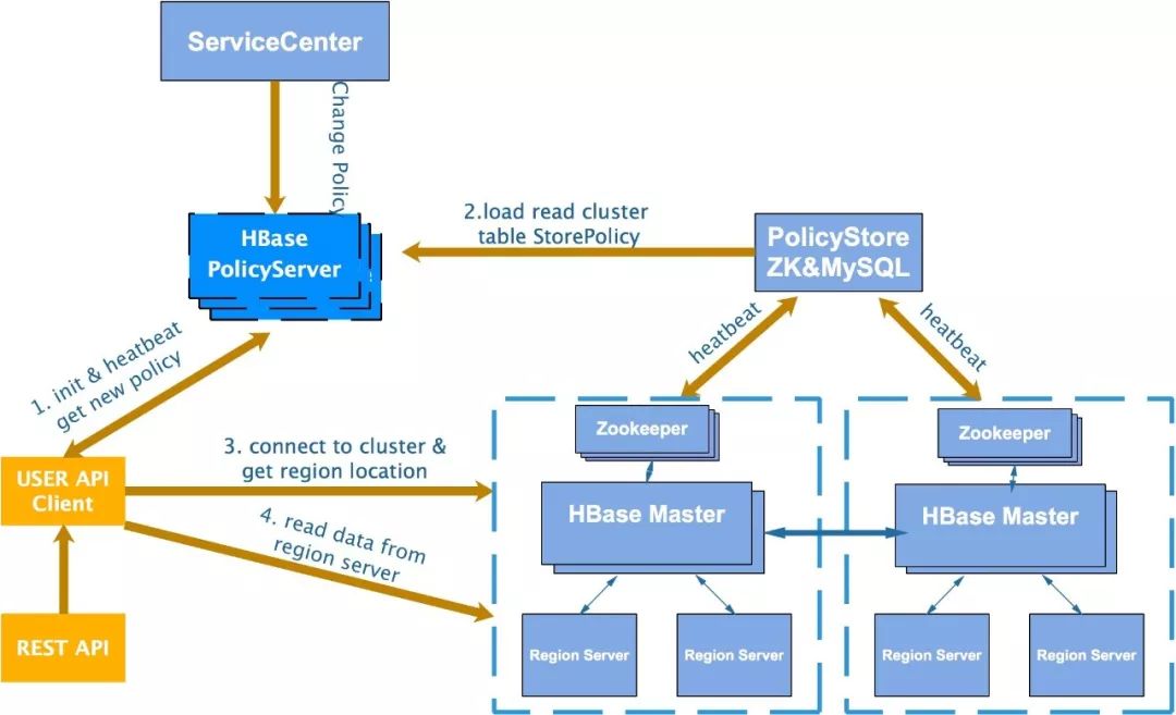 其主要工作组件由服务中心、HBase PolicyServer、客户端三部分构成: