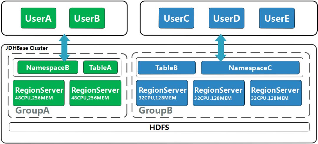 HBase早期的使用方式是一个业务一个集群,但是资源利用率低,维护成本高。虽然也可以多个业务共用一个集群,但是会有资源竞争和故障扩散等问题,例如一个业务出现异常可能会影响整个集群的可用性。基于以上的原因,我们引入了HBase2.0的rs分组功能,并进行了改进完善。实现了将HBase集群动态切分成多个分组,每个分组中有多台物理服务器。这样既能将业务进行物理隔离防止资源竞争和故障扩散,还能在618和11.11大促时期动态调整集群资源,提升硬件资源利用率。另外在异构集群下,可以按不同的资源配置进行分组,然后把性能要求高业务放在高配的分组中增加读写吞吐。