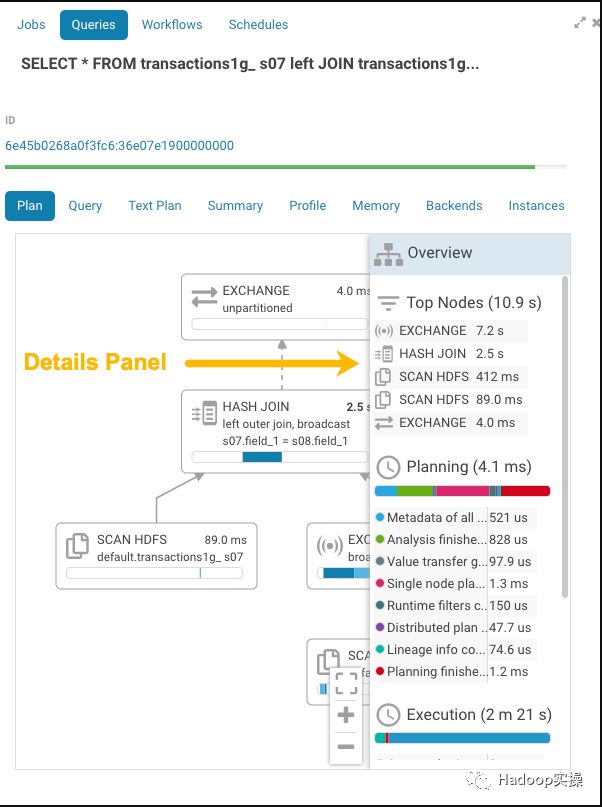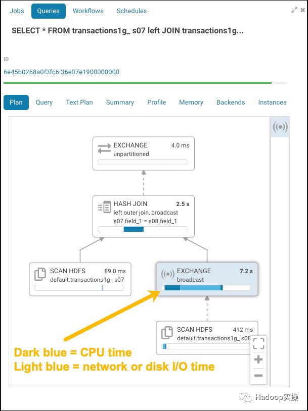 Impala SQL查询profiles的图形显示在很多细节方面得到了增强。新添加的这些信息可帮助您了解查询瓶颈发生的位置和原因,以及如何优化查询以消除它们。例如,现在可以提供有关查询执行的每个节点的CPU处理时间和网络或磁盘I/O时间的详细信息: