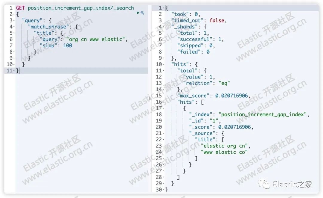 GET position_increment_gap_index/_search{"query": {"match_phrase": {"title.slop_10": {"query": "org cn www elastic","slop": 10}}}}