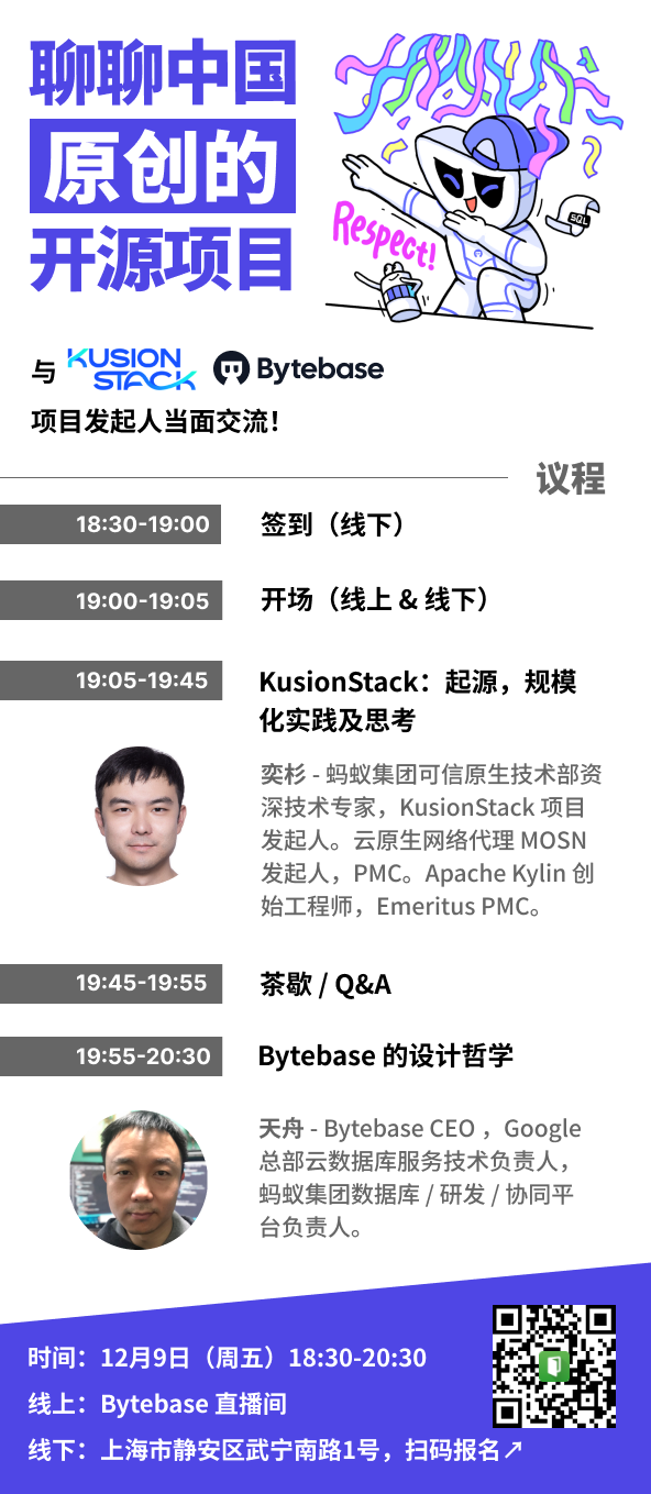 参与 meetup 的小伙伴,准备好你的问题,预先告诉 BB 小助手或现场留言提问,被选中问题的小伙伴也可以获得 Bytebase 周边哟!