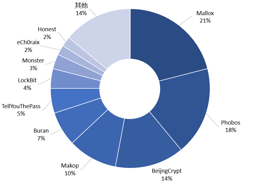 下图是美创安全实验室对勒索病毒监测后所计算出的11月份勒索病毒家族流行度占比分布图,Mallox勒索病毒家族占比21%居首位,其次是占比18%的Phobos家族,BeijingCrypt家族以14%位居第三。
