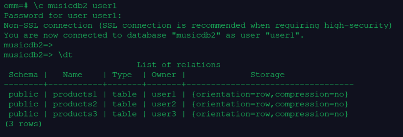 2.分别使用user1、user2、user3访问数据库musicdb2,创建各自的表,并插入数据。表名和数据如下: