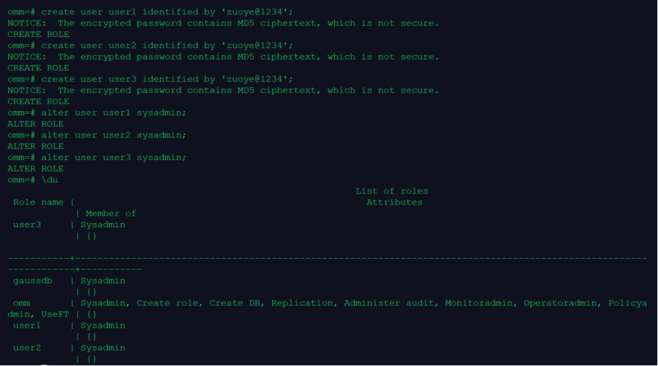 1.创建用户user1、user2、user3,授予user1、user2、user3数据库系统的SYSADMIN权限