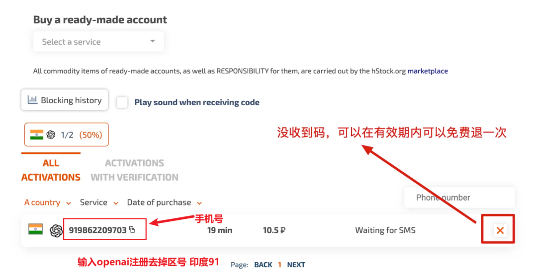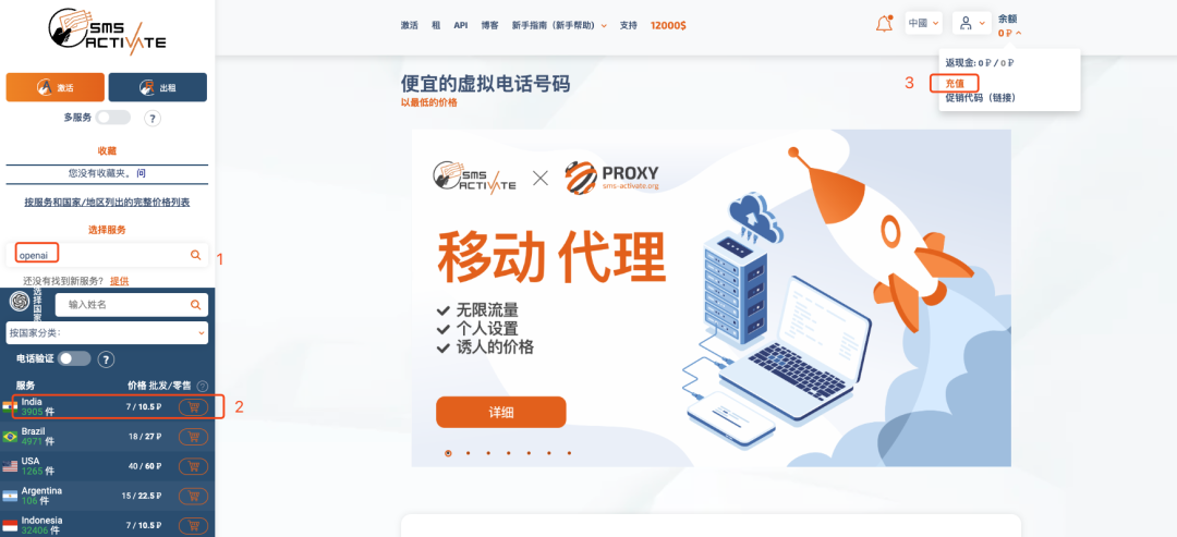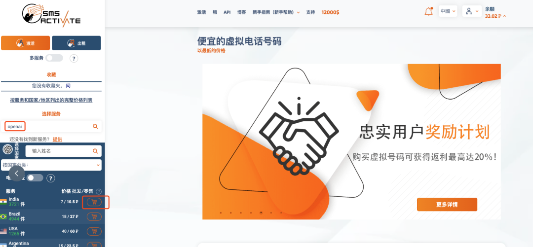 2.4 充值到账之后,搜索openai,选择第一个India 加入购物车,网站会给你提供一个手机号