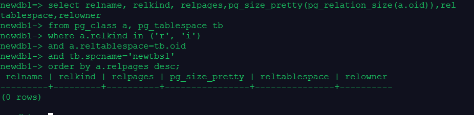 select relname, relkind, relpages,pg_size_pretty(pg_relation_size(a.oid)),reltablespace,relowner