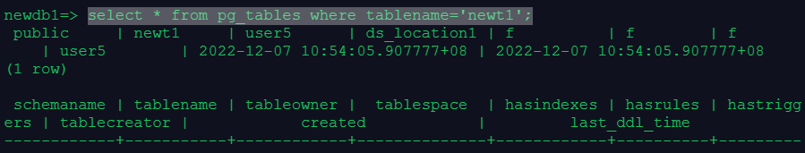 create table newt1(col char(100)) tablespace ds_location1;4、查看表所在的表空间。