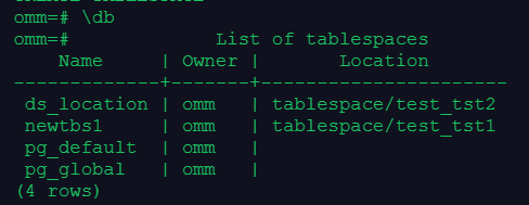 create tablespace ds_location1 relative location 'tablespace/test_tst2';#查看表空间