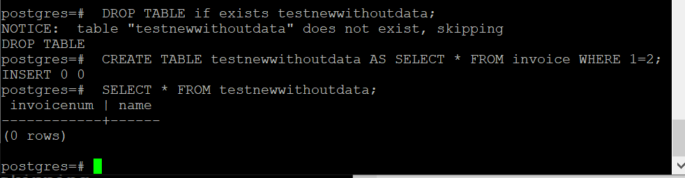 CREATE TABLE testnewwithoutdata AS SELECT * FROM invoice WHERE 1=2;