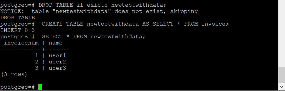 CREATE TABLE newtestwithdata AS SELECT * FROM invoice;