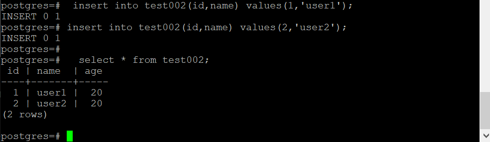 --下面的SQL insert语句,在向表test插入数据时,没有提供age列的值: