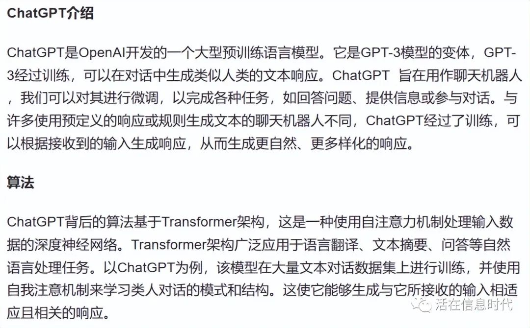 但是在文末的最后,作者给了大家一个彩蛋,表示这篇文章本身即是ChatGPT自己写的。例如上图中的“ChatGPT介绍”一节,即是作者在向ChatGPT提问:什么是ChatGPT?之后得到的回答,类似的,“算法”一节,则是作者在提问了“ChatGPT背后的算法是什么?”之后得到的回答。