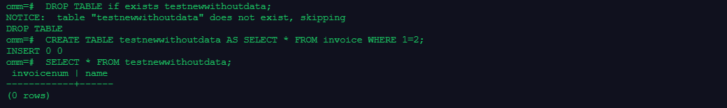 CREATE TABLE testnewwithoutdata AS SELECT * FROM invoice WHERE 1=2;