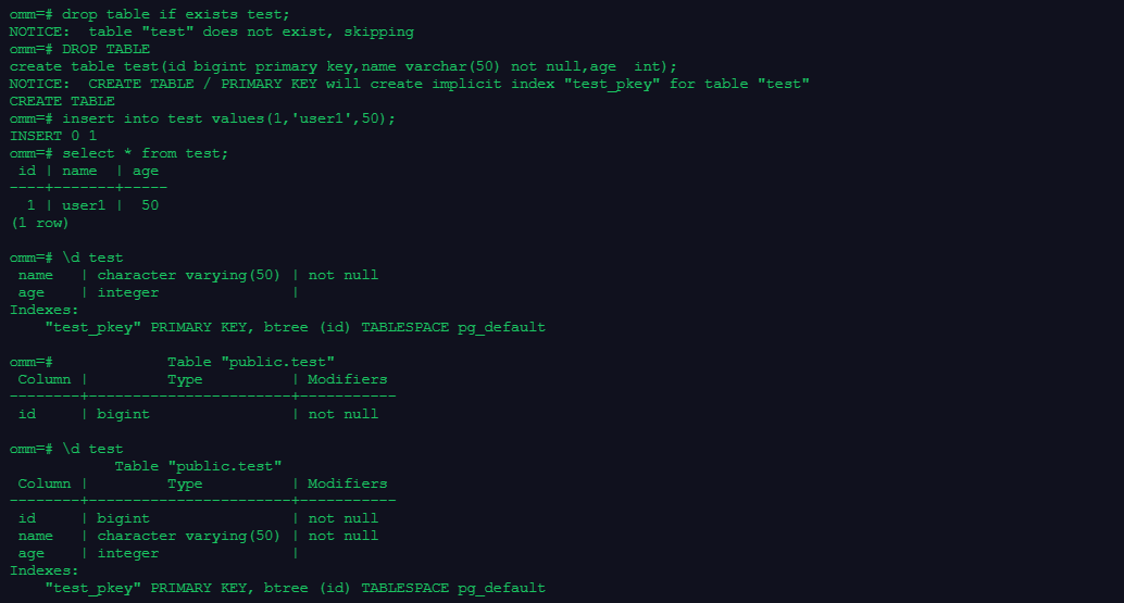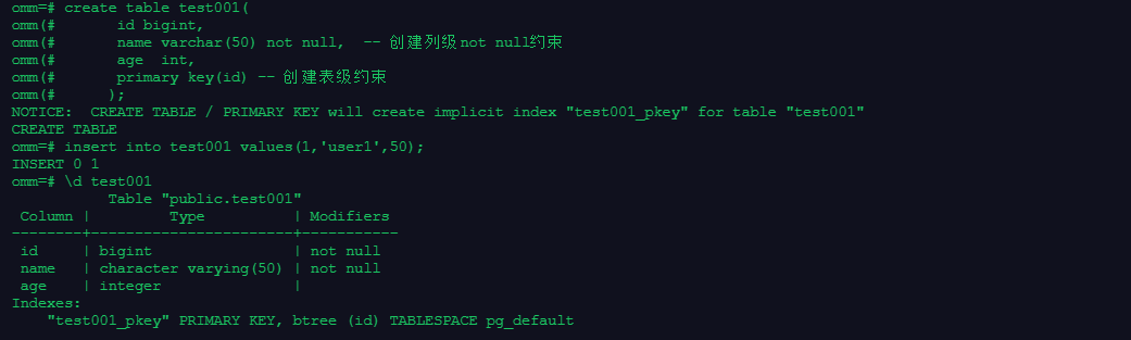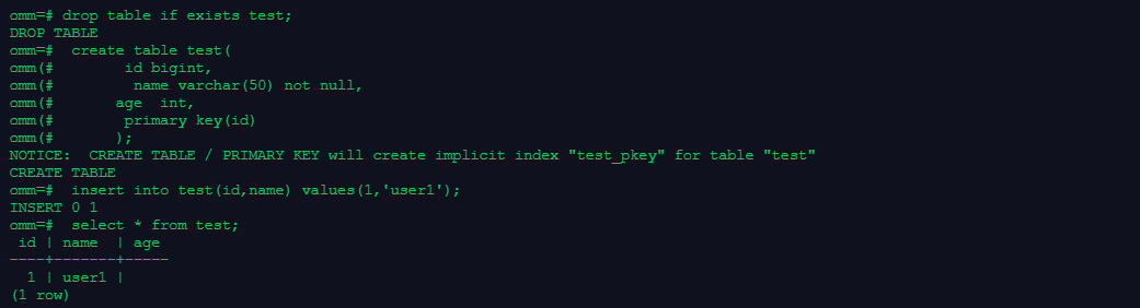 create table test(id bigint primary key,name varchar(50) not null,age int);