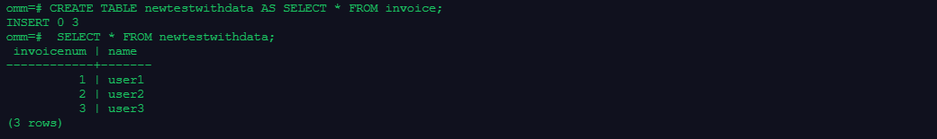 CREATE TABLE newtestwithdata AS SELECT * FROM invoice;