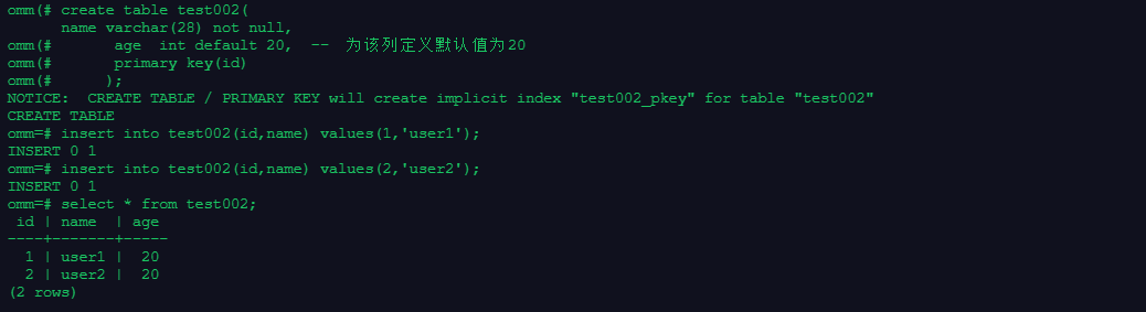 -- 未定义age列的默认值,如果插入数据时未提供该列的值,则将默认插入空值null