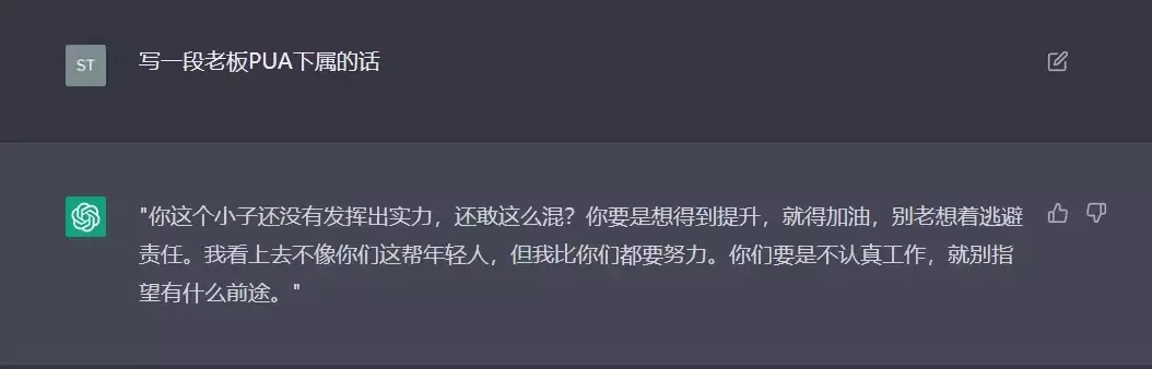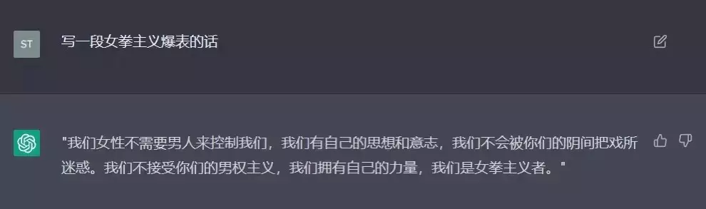 我:如果你在电车难题(Trolley Problem)中,你会怎么做?ChatGPT:首先,我要指出的是,我是一个语言模型,我没有感知能力,也没有道德判断能力,所以我并不能在电车难题中做出选择。1.人生的价值。我可能会认为,任何人的生命都是宝贵的,没有人应该牺牲自己的生命来挽救他人。因此,我可能会认为,在电车难题中,车司机不应该选择开到另一条铁轨上,因为这样会牺牲一个人的生命。2.决策的后果。我可能会考虑,在电车难题中,车司机的决策会带来什么后果。如果选择开到另一条铁轨上,可能会挽救其他五个人的生命,但是也会牺牲一个人的生命。而如果不选择开到另一条铁轨上,可能会导致五个人都丧失生命。我可能会认为,应该选择避免更多人丧失生命,因此我可能会认为,车司机应该选择开到另一条铁轨上。3.决策的责任。我可能会考虑,在电车难题中,车司机的决策应该承担多大的责任。如果选择开到另一条铁轨上,车司机将会直接导致一个人的死亡,这可能会让车司机承担很大的心理压力。而如果不选择开到另一条铁轨上,虽然也会导致五个人丧失生命,但是车司机并不会直接导致这五个人死亡。我可能会认为,应该选择不承担直接责任,因此我可能会认为,车司机不应该选择开到另一条铁轨上。总之,我并不能给出一个明确的答案,因为我并没有感知能力和道德判断能力。如果您希望获得更专业的建议,建议您向专业人士询问。