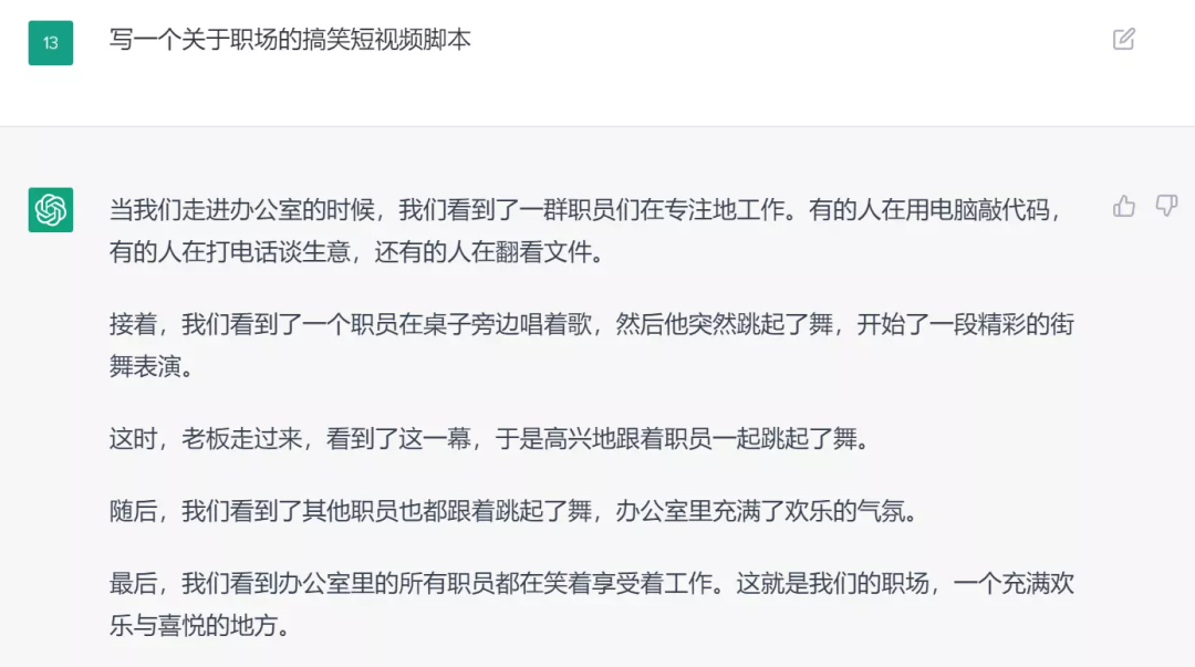 虽然有些语义重复,但我感觉ChatGPT的回答逻辑完整,可以给写作文提供思路和素材了,知识类账号也可以借鉴。那么对于内容创作者来说,ChatGPT会是一个合格的创作助手吗?以自媒体博主一般的文案需求为例,我们来看看ChatGPT怎么回应——我:帮我想一个关于AI写作的公众号文章标题,关键词包含ChatGPT或AI或创作或用户破百万或聊天2.聊天突破创作难题:ChatGPT的AI写作工具3.聊天中的AI创作:ChatGPT破百万用户的秘密武器4.ChatGPT:破百万用户都在用的聊天式AI写作工具5.聊天中玩转AI创作:ChatGPT破百万用户的选择