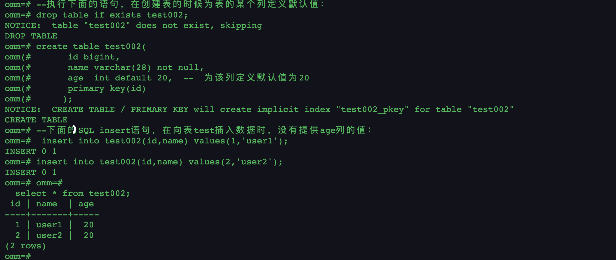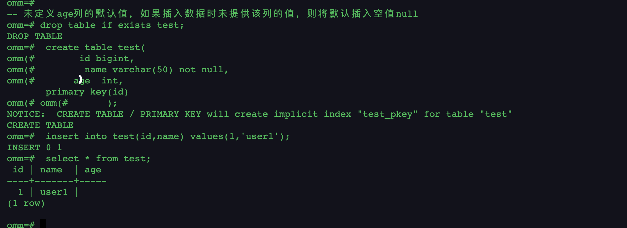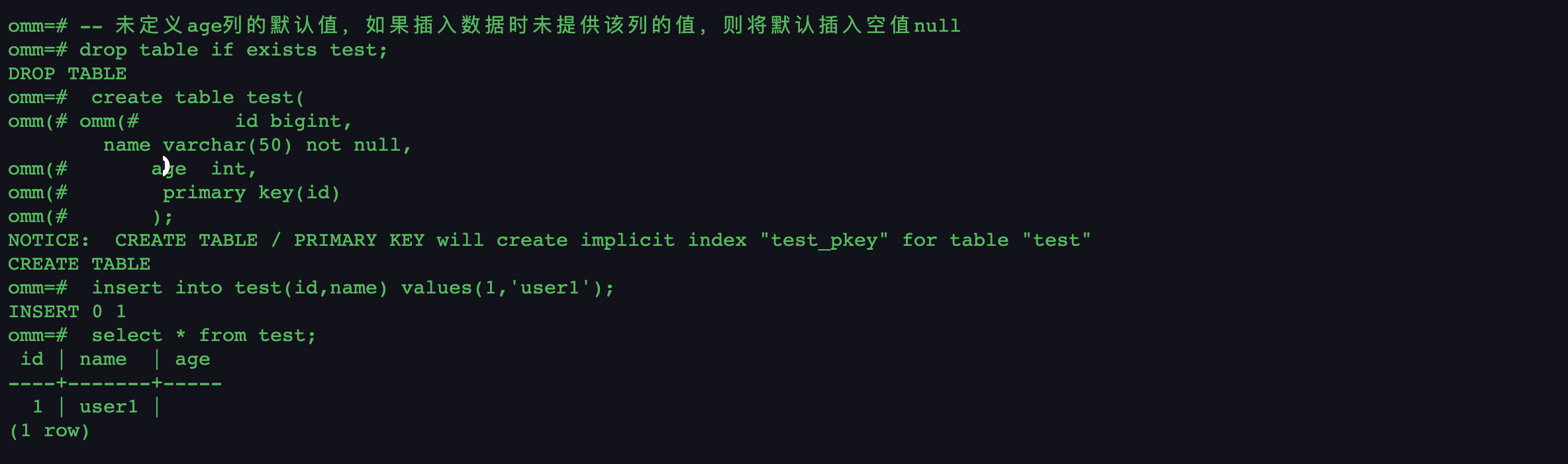 -- 未定义age列的默认值,如果插入数据时未提供该列的值,则将默认插入空值null