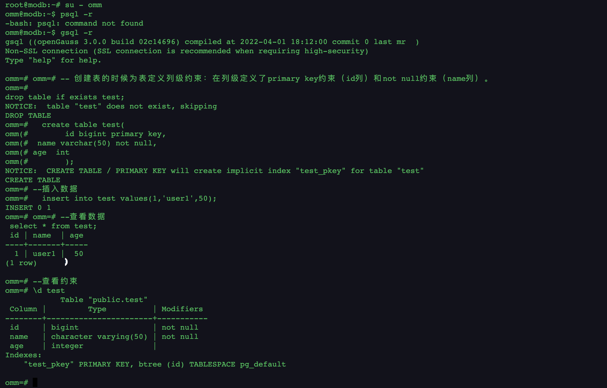 #这里在表列级定义了primary key约束(id列),在列级定义了not null约束(name列)。