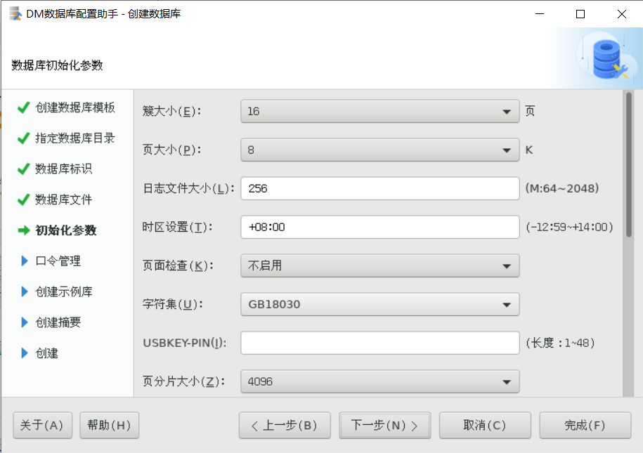 注意:簇大小、页大小、字符集、大小写敏感等一旦指定,数据库创建完成将无法更改。