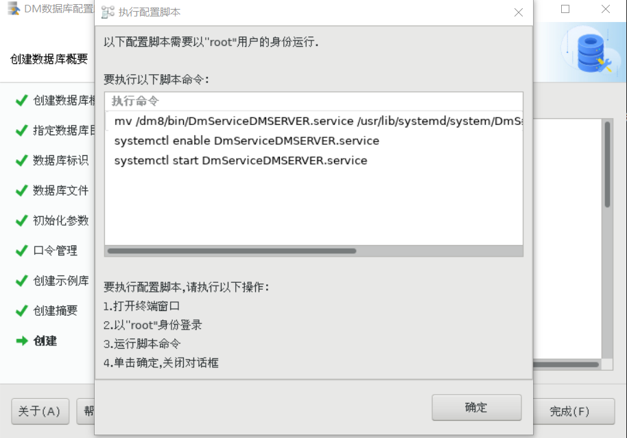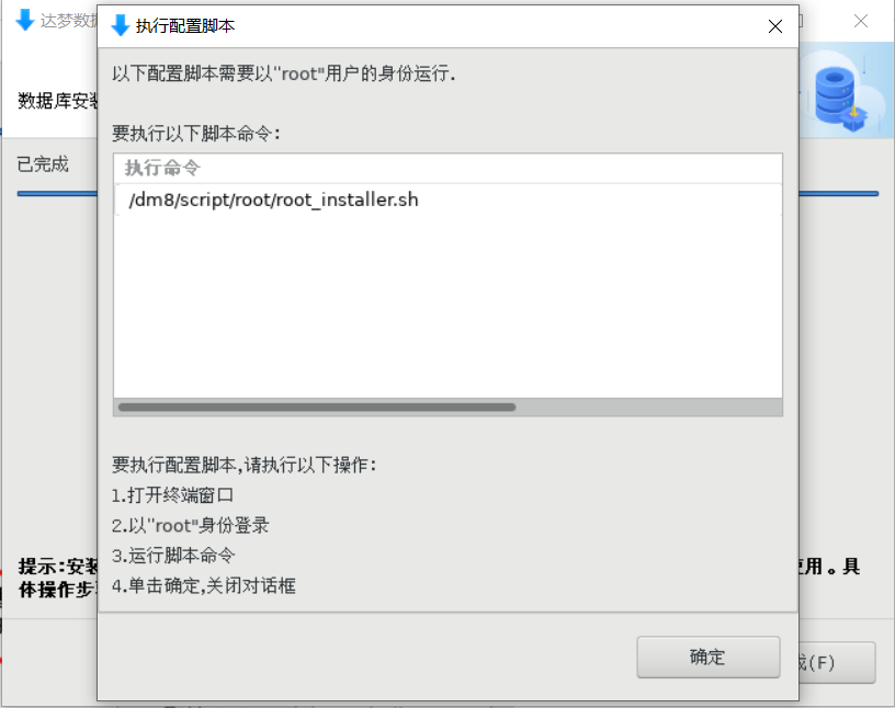 脚本执行完成后点击确定弹出如下窗口,点击完成即可。